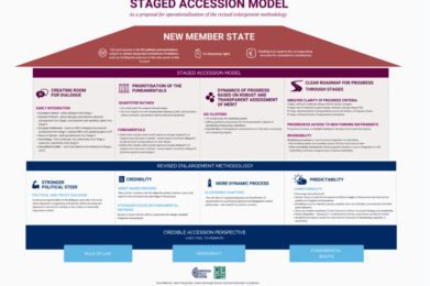 Template 2.0 emerged from wide-ranging consultations with officials from EU institutions and member states, as well as a series of publications that delved into the specific elements of the original proposal. The purpose of the revised approach was to provide a more detailed roadmap for the Model’s operationalisation in practice and make the most of the newly ignited enlargement momentum. In particular, it outlined a step-by-step pathway towards maximising the potential of gradual institutional and financial incentives, while also describing how post-accession veto limitations, including safeguard clauses, could be implemented in line with the EU’s legal order.